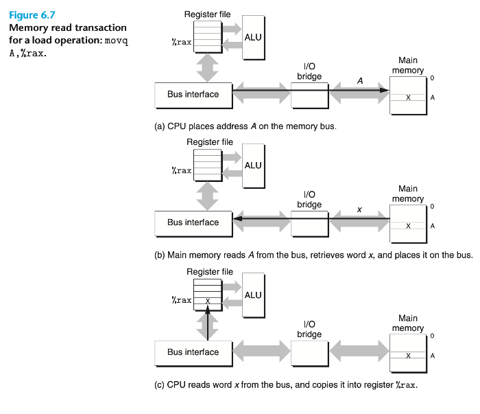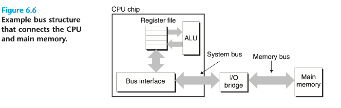 CPU와 DRAM 주메모리 간 데이터 흐름은 공유 전기 경로인 버스(bus)를 통해 이루어진다. 하나의 데이터 이동은 버스 트랜잭션이라 불리며, 읽기 트랜잭션은 메모리에서 CPU로 데이터를 전송하고, 쓰기 트랜잭션은 CPU에서 메모리로 데이터를 보낸다.