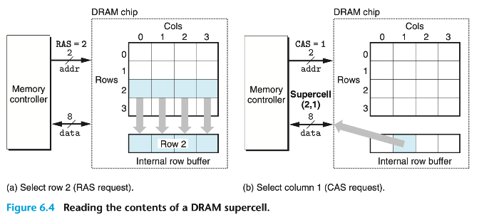 메인 메모리는 여러 개의 메모리 모듈로 구성된다. 메모리 컨트롤러는 주어진 메모리 주소 A를 받아, 적절한 모듈을 선택하고, 그 모듈에 대해 (i, j) 형태의 슈퍼셀 주소로 변환하여 데이터를 요청한다. 각 DRAM은 자신의 (i, j) 슈퍼셀의 8비트 데이터를 출력하고, 모듈 내 회로가 이 데이터를 모아 64비트 단어로 조합하여 CPU로 전송한다.
