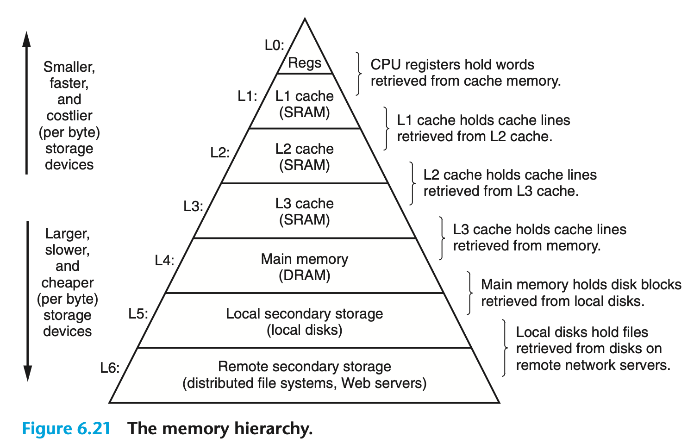 이 두 특성이 서로 보완적으로 작용하여, 현대 시스템은 메모리 계층구조(memory hierarchy)라는 방식을 통해 메모리를 구성한다. 메모리 계층 구조는 빠르고 작은 저장장치가 느리고 큰 저장장치를 캐시(cache)하는 구조로 되어 있다.