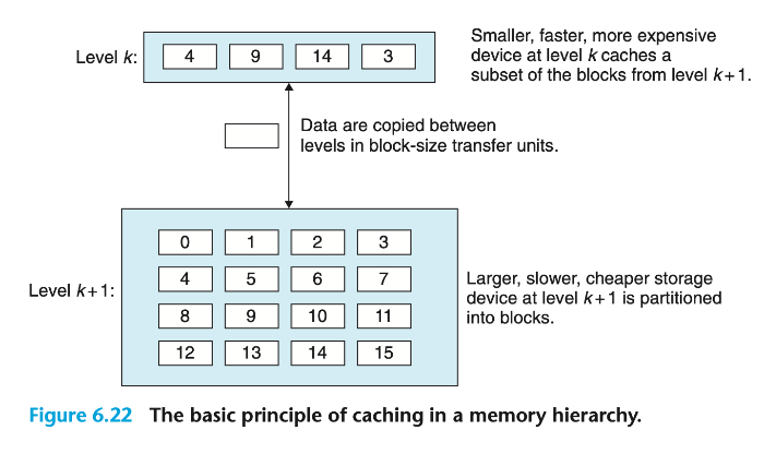 - 계층 k에 있는 작은 고속 저장장치는, 계층 k+1에 있는 큰 저속 저장장치의 데이터를 일부 복사해 저장한다.