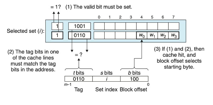 주소의 태그 비트, 세트 인덱스 비트, 블록 오프셋 비트로 나누어 캐시 탐색이 이루어진다​.
