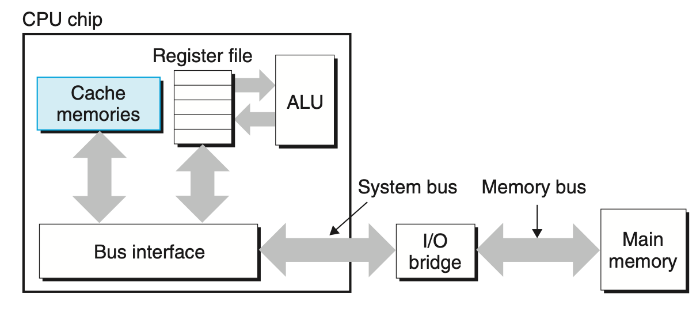 하지만 CPU와 메인 메모리 사이의 성능 격차가 점점 커지면서, 시스템 설계자들은 CPU 레지스터 파일과 메인 메모리 사이에 작은 고속 L1 캐시를 추가하게 되었다​.