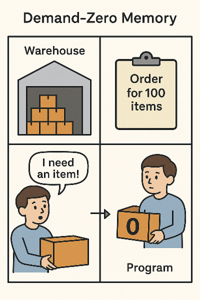Demand-Zero Memory란 "처음 접근할 때 0으로 초기화된 메모리"를 말한다.