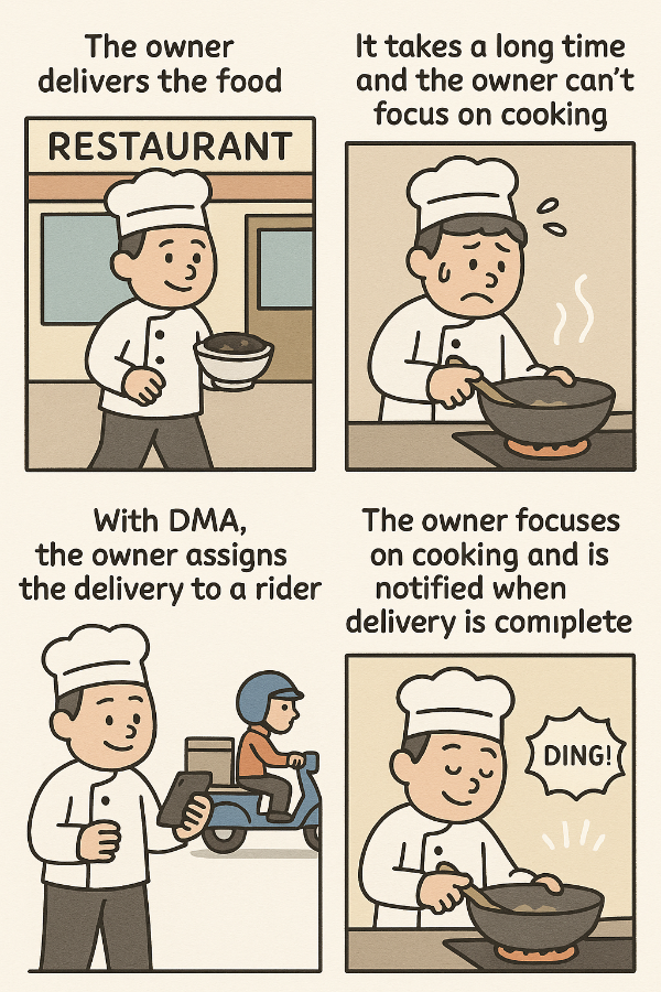 • DMA: 라이더에게 맡기고 → 사장님은 요리에 집중, 배달 완료되면 알림을 받는다.