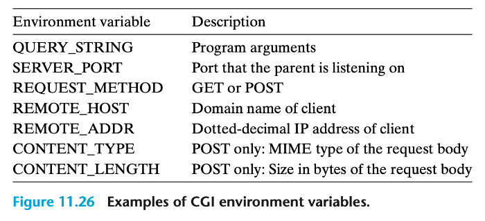 서버는 CGI 프로그램에 단순히 인자만이 아니라 다양한 환경 정보를 함께 전달할 수 있다. 이 정보들은 환경변수(environment variables)의 형태로 전달되며, 다음은 그 예시이다 (그림 11.26 참조):