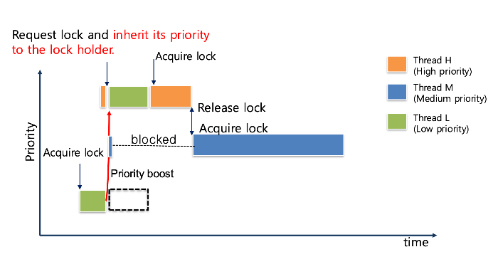 즉, 낮은 우선순위의 스레드(L)가 자원을 점유하고 있음에도, 중간 우선순위의 스레드(M)가 계속 실행되면서, 높은 우선순위의 스레드(H)가 무한정 대기하게 되는 비정상적인 상황이 발생하는 것이다.