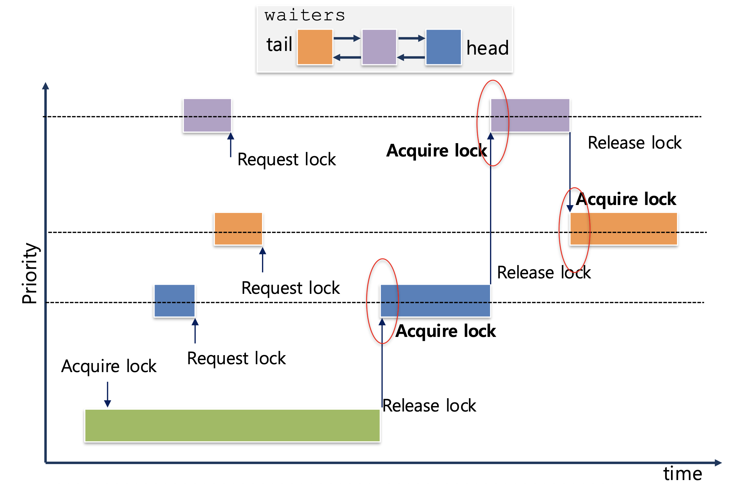 • 잠금(또는 조건 변수)을 기다리는 스레드 집합에서 스레드의 우선순위에 따라 대기 중인 스레드를 깨운다.