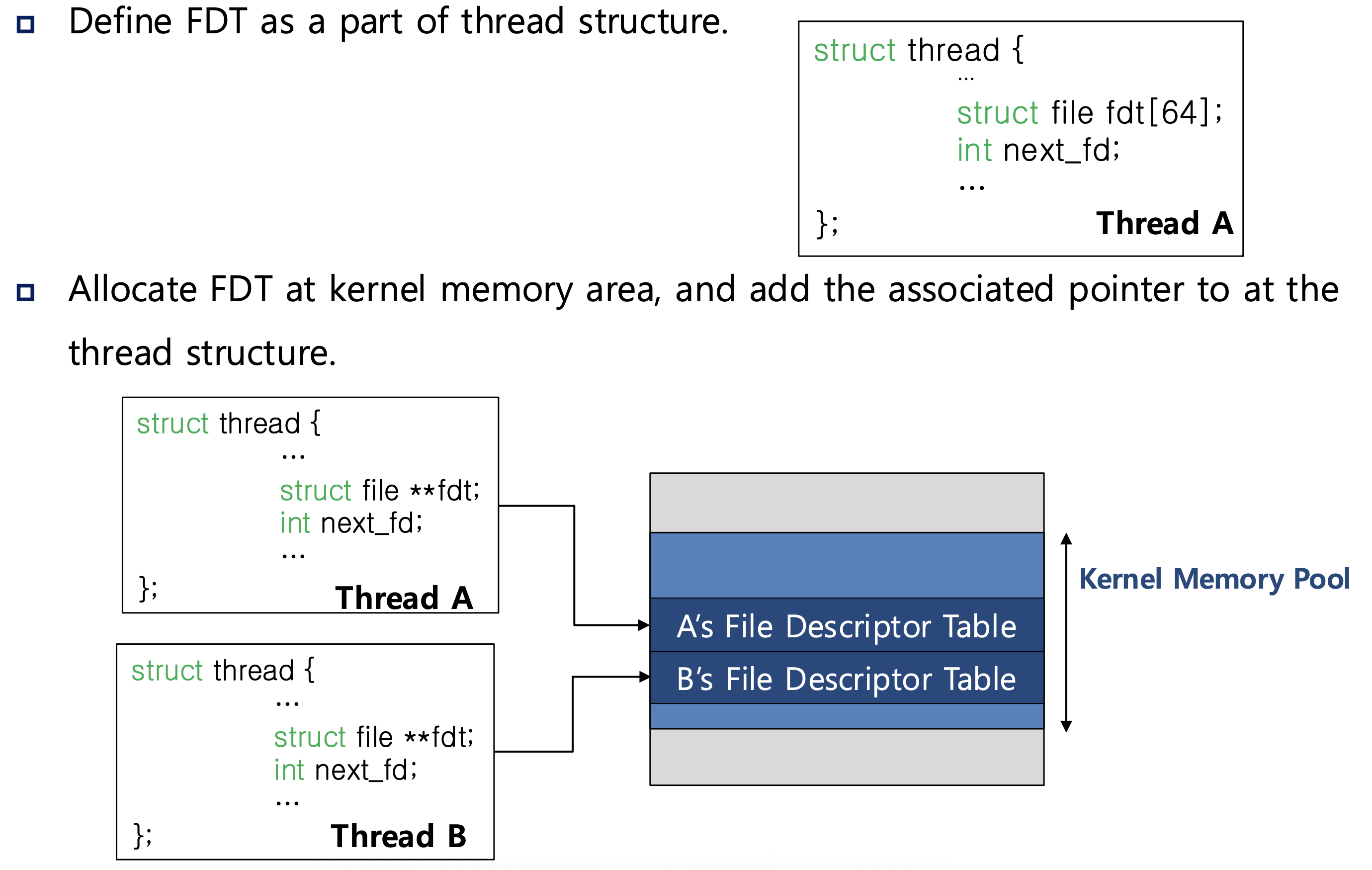프로세스마다 자신만의 File Descriptor Table (FDT)이 있어야 하고, 이는 struct thread 안에서 fdt 포인터로 관리된다.