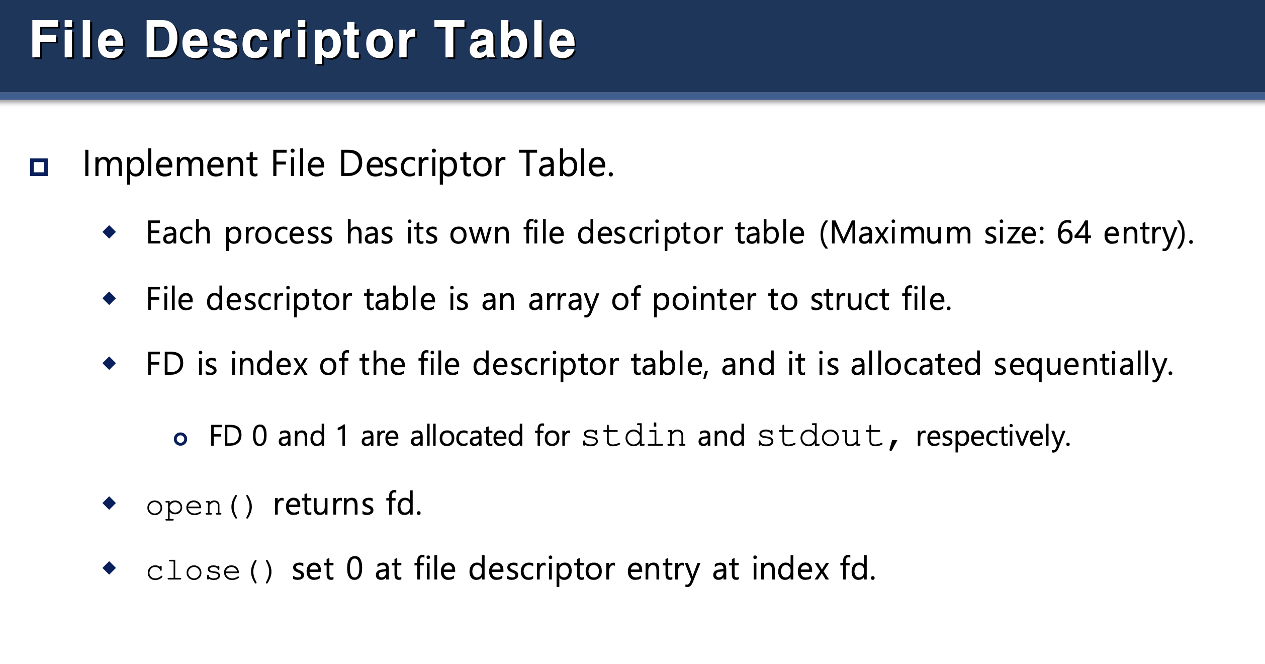 - 각 프로세스는 자체 파일 디스크립터 테이블을 가진다(최대 크기: 64개 항목).