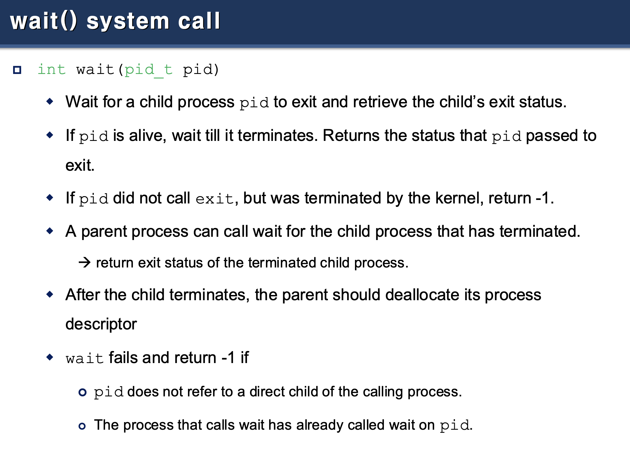 • 부모가 wait(pid)를 호출하면 해당 자식 프로세스의 종료를 기다렸다가,