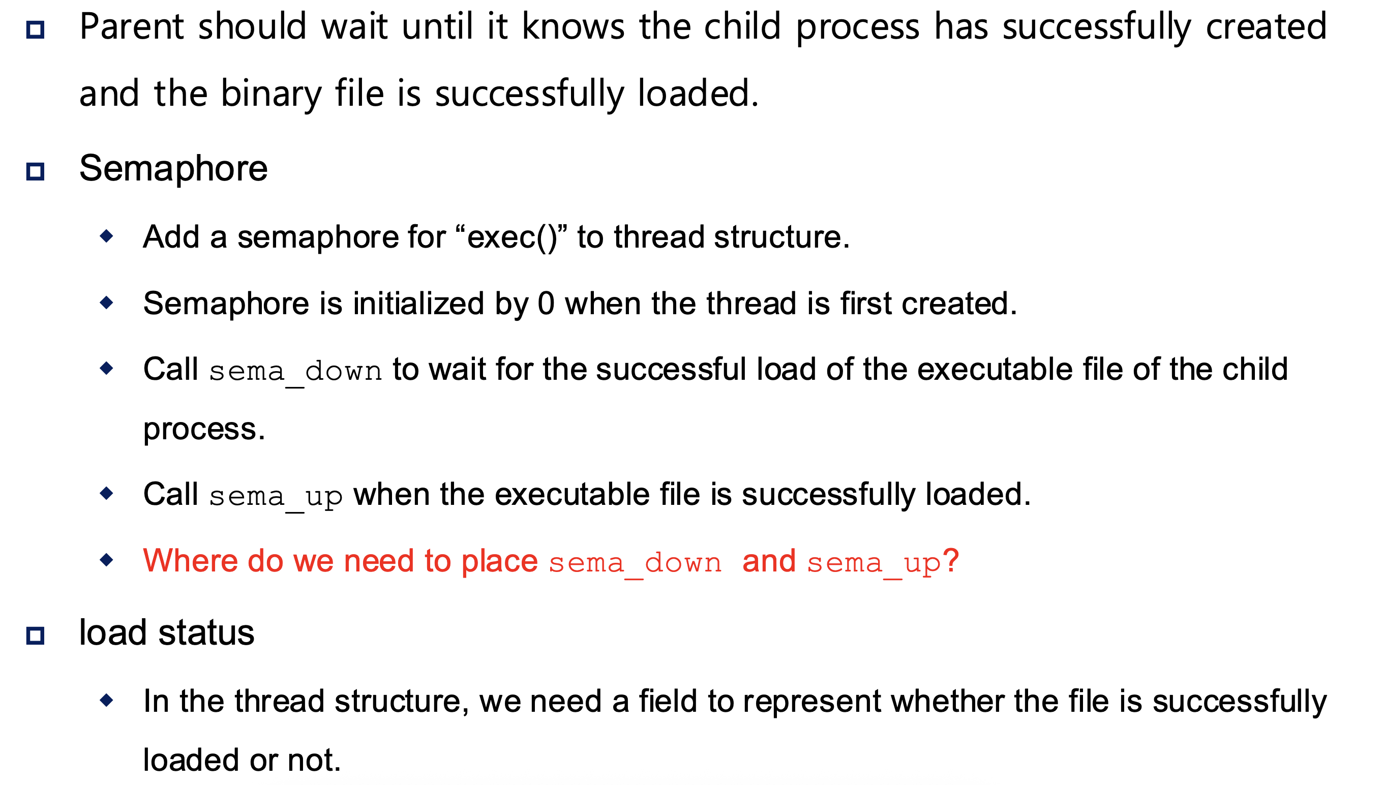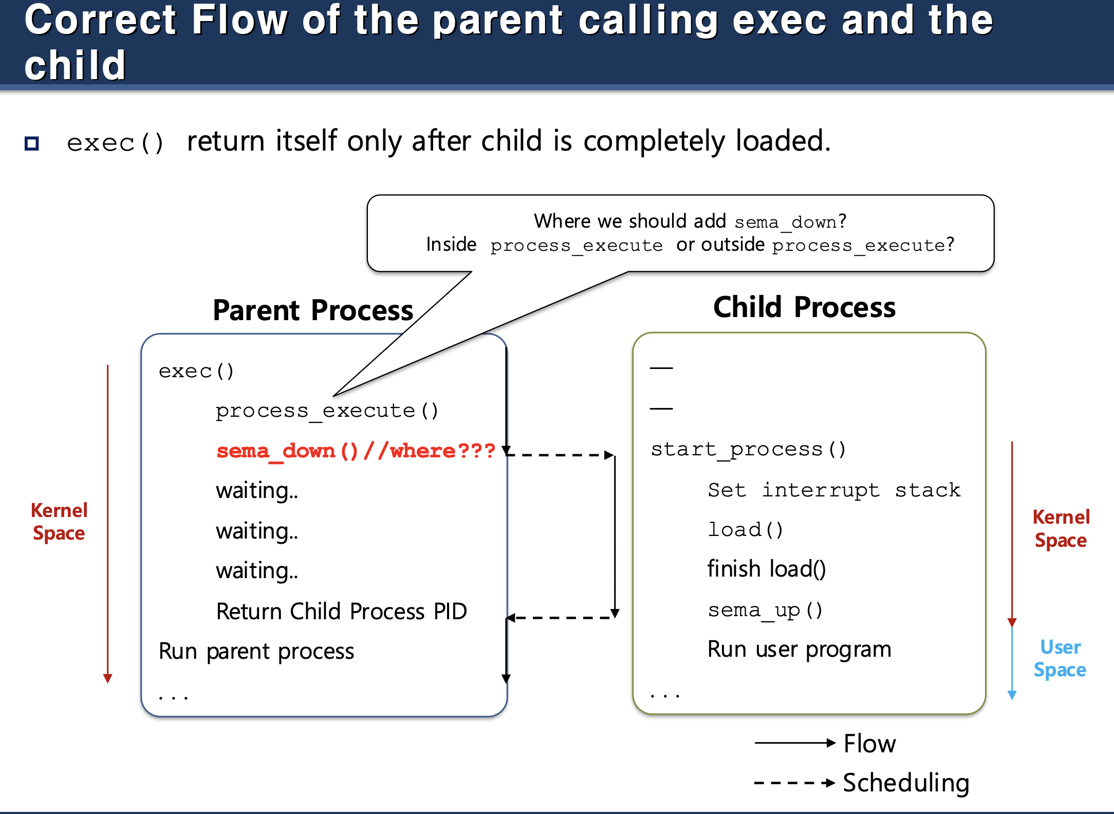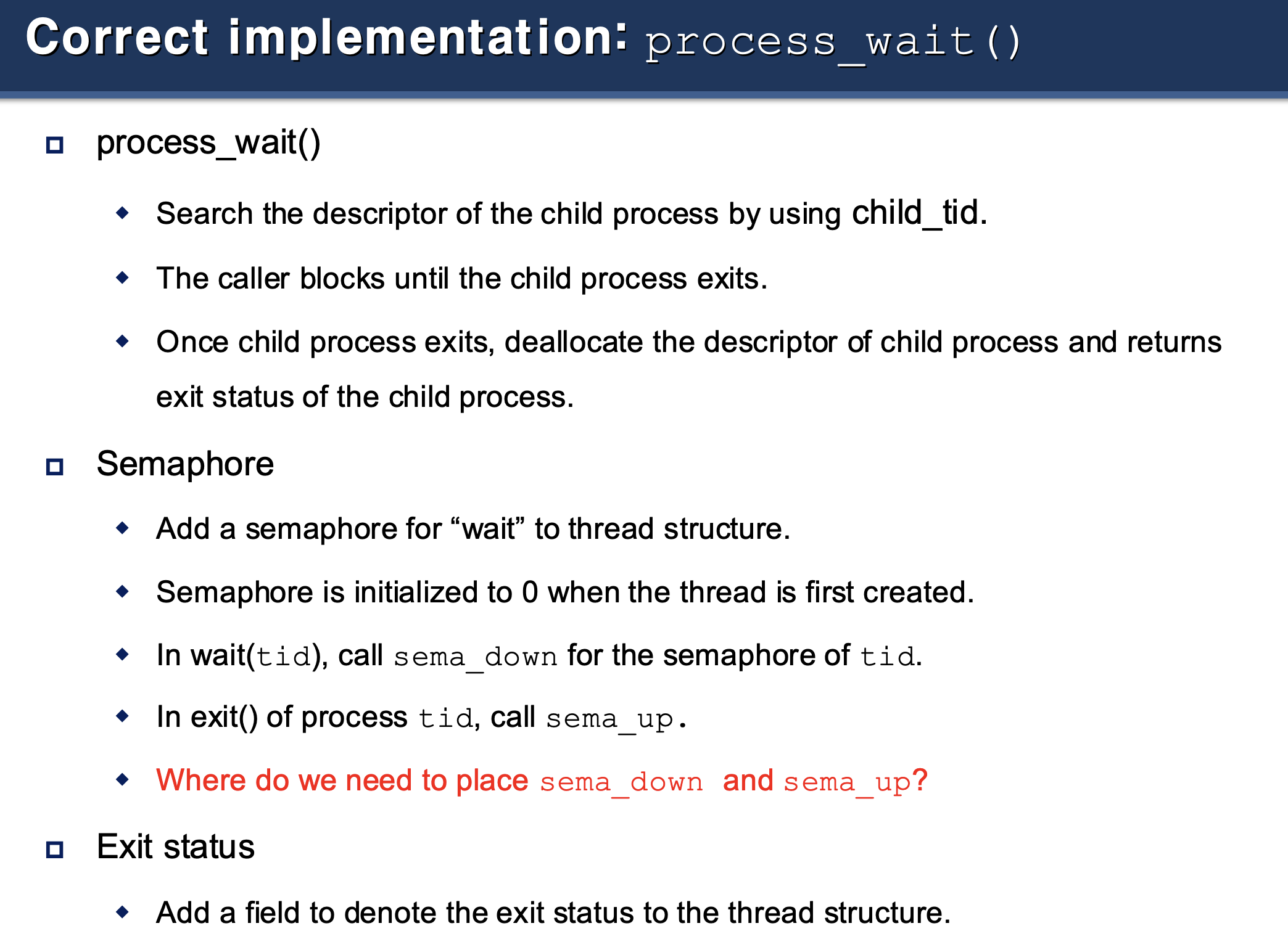 • Pintos에서는 프로세스 종료 시점에 부모가 wait 하지 않으면 자식이 무한 block 될 수 있음