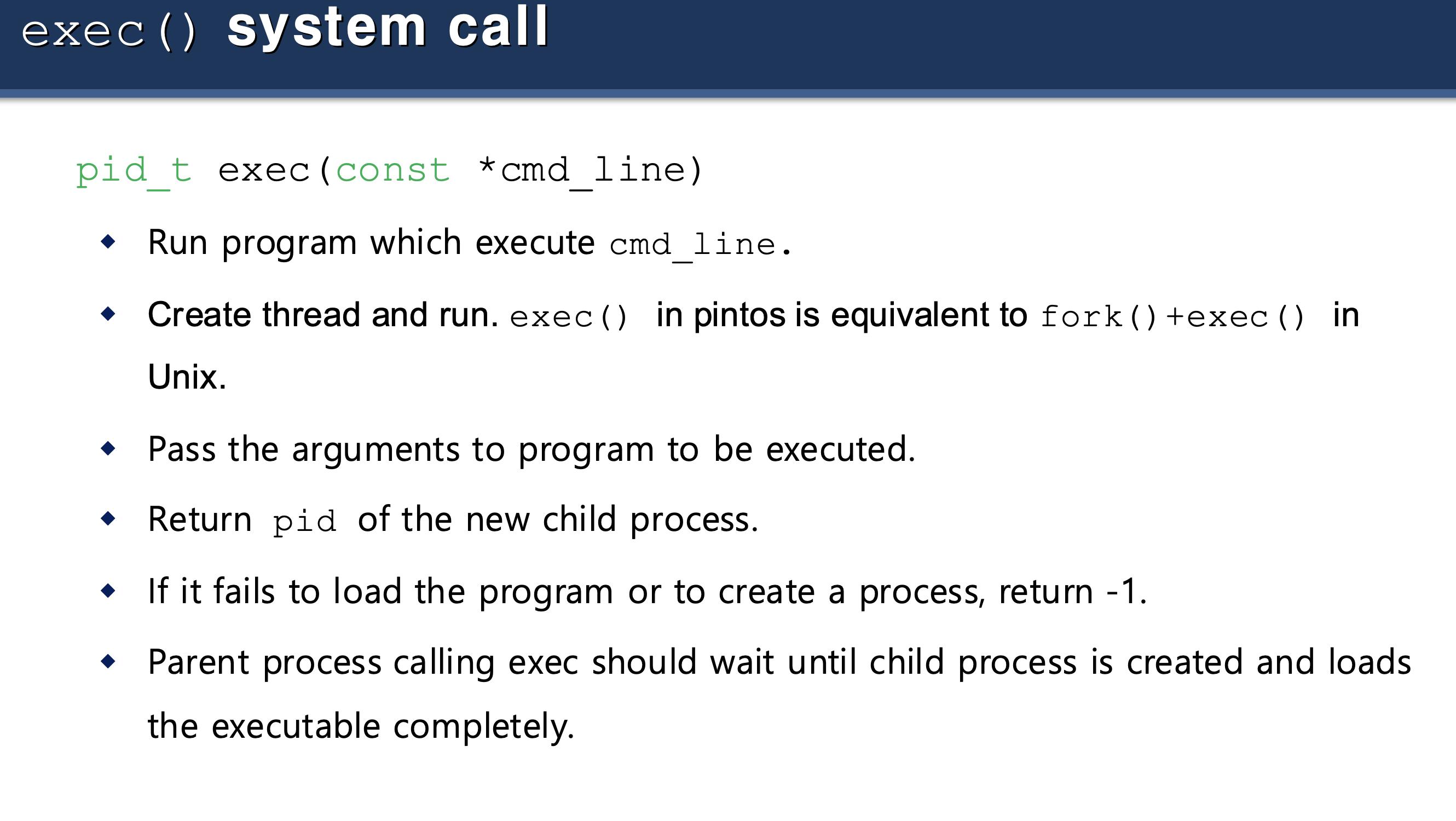 • exec(const char *file_name) 함수는 Pintos의 시스템 콜 핸들러에서 SYS_EXEC을 처리하기 위한 커널 함수로, 현재 프로세스를 file_name에 해당하는 새 실행파일로 완전히 덮어쓰기 위한 준비를 하는 함수이다.
