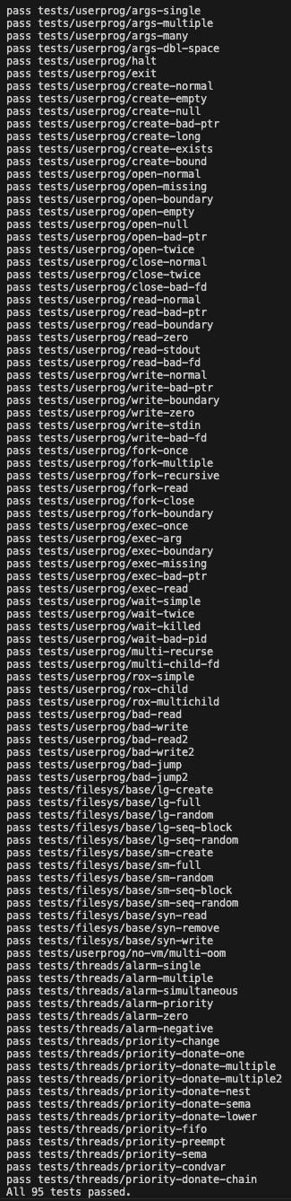 이렇게 해서 userprogram 구현을 마쳤다. 마지막으로 ALL PASS되는지 확인하고 그렇지 않다면 어디가 문제인지 디버깅을 통해 해결해 나가면 될 것이다.