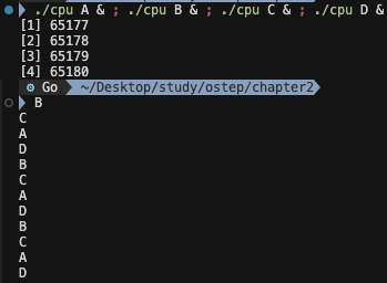 이 코드를 cpu.c라는 이름으로 저장하고 단일 프로세서 시스템에서 컴파일하고 실행시킨다고 가정하자. 다음과 같은 출력을 볼 수 있을 것이다.