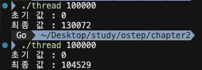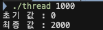 기본 아이디어는 간단하다. 메인 프로그램은 Pthread_create()를 사용하여 두 개의 쓰레드를 생성한다. 쓰레드를 동일한 메모리 공간에서 함께 실행 중인 여러 개의 함수라고 생각할 수 있다. 이 예제 코드에서 각 쓰레드는 worker()라는 루틴을 실행한다. worker() 루틴은 loops번만큼 루프를 반복하면서 카운터 값을 증가시킨다. loops 값을 1000으로 설정하면 아래와 같은 출력을 얻는다.