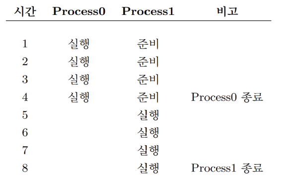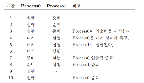 4. Process1이 실행되는 동안 입출력이 완료되고 Process0은 준비 상태로 다시 전이된다.