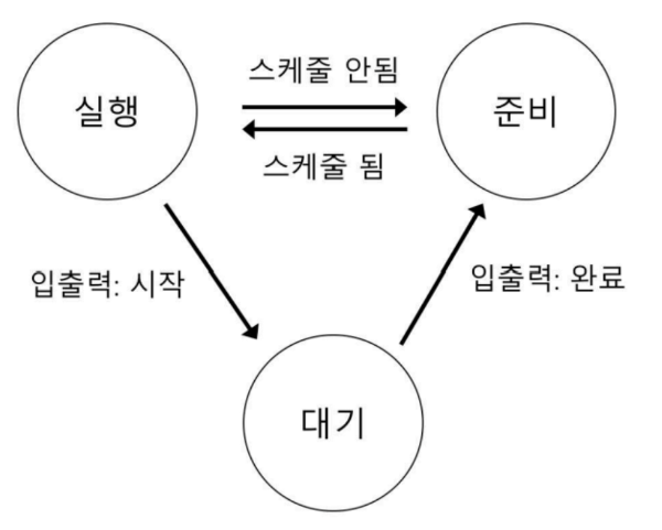 ‘실행’ 상태에서 ‘준비’ 상태로의 전이는 프로세스가 나중에 다시 스케줄 될 수 있는 상태가 되었다는 것을 의미한다. 프로세스가 입출력 요청 등의 이유로 대기 상태가 되면 요청 완료 등의 이벤트가 발생할 때까지 대기 상태로 유지된다. 이벤트가 발생하면 프로세스는 다시 준비 상태로 전이되고 운영체제의 결정에 따라 바로 다시 실행될 수 있다.