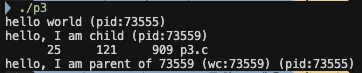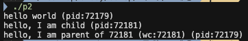 printf("hello, I am parent of %d (wc:%d) (pid:%d)\n",rc, wc, (int) getpid());