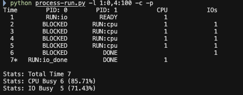 이 프로그램 process-run.py를 통해 프로그램이 실행되고 CPU를 사용하거나(예: 명령어 추가 수행) I/O를 수행할 때(예: 디스크에 요청을 보내고 완료될 때까지 기다림) 프로세스 상태가 어떻게 변하는지 볼 수 있다. 자세한 내용은 README를 참조하라.