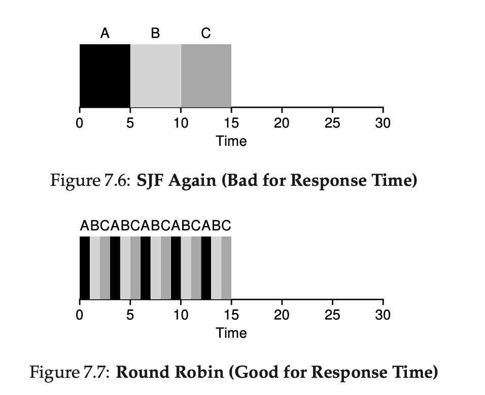 사용자와의 상호작용이 중요해진 상황에서 STCF는 더 이상 적절한 스케줄링 기법이 아니다. 응답 시간을 개선하면서도 시스템의 전반적인 성능을 높일 수 있는 새로운 스케줄링 알고리즘이 필요해진 것이다.