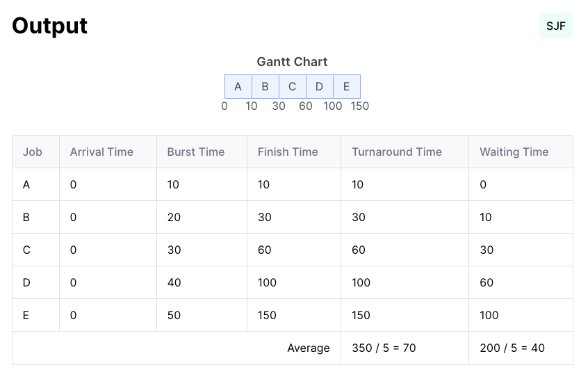 이렇게 되면 평균 대기 시간은 (0 + 3 + 8) / 3 = 3.67초, 평균 응답 시간은 (0 + 3 + 8) / 3 = 3.67초, 평균 반환 시간은 (3 + 8 + 10) / 3 = 7초가 된다.