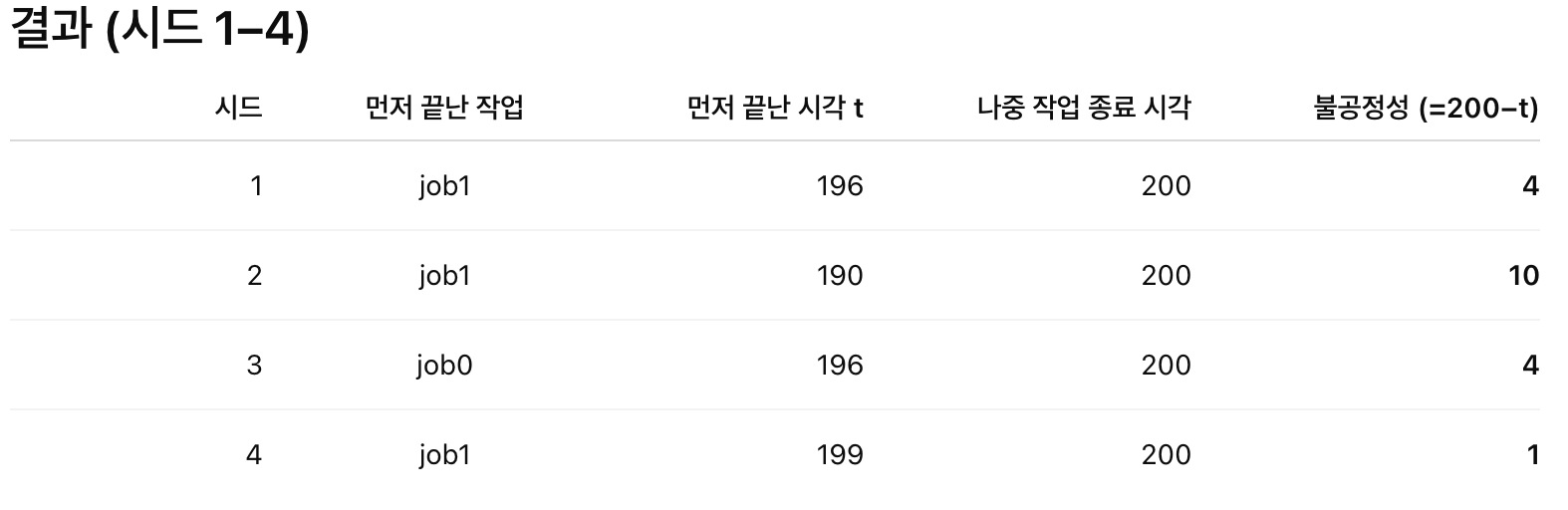 1. 3개의 작업과 난수 시드 1, 2, 3으로 시뮬레이션한 솔루션을 계산하세요. (계산 과정은 GPT로 정리함)