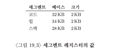 만약 가상 주소가 주소 공간의 크기(여기서는 4KB)를 초과하거나 음수라면, 즉 바운드 레지스터로 정의된 범위를 벗어나면 폴트(fault)가 발생하고 예외(exception)가 처리된다.