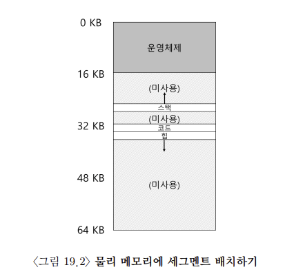 그림을 보면 64 KB의 물리 메모리에 3개의 세그먼트와 운영체제용으로 예약된 16 KB 영역이 존재한다. 그림에서 볼 수 있듯이, 사용 중인 메모리에만 물리 공간이 할당된다. 이러한 구조는 사용되지 않은 영역이 많은 대형 주소 공간(드문드문 사용되는 주소 공간(sparse address space)이라고도 부름)을 수용할 수 있다.