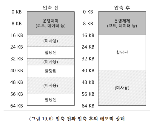 이 문제의 해결책 중 하나는 기존의 세그멘트를 정리하여 물리 메모리를 압축(compact)하는 것이다. 예를 들어, 운영체제는 현재 실행 중인 프로세스를 중단하고, 그들의 데이터를 하나의 연속된 공간에 복사한 후, 세그멘트 레지스터가 새로운 물리 메모리 위치를 가리키게 하여, 자신이 작업할 큰 빈 공간을 확보한다. 이렇게 함으로써 운영체제는 새로운 할당 요청을 충족시킬 수 있다. 그러나 세그멘트 복사는 메모리에 부하가 큰 연산이고 일반적으로 상당량의 프로세서 시간을 사용하기 때문에 압축은 비용이 많이 든다. 압축 작업 후의 물리 메모리는 그림 19.6(오른쪽)에 나와 있다.