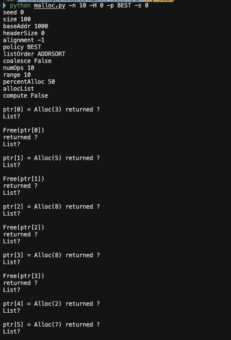 1.먼저 -n 10 -H 0 -p BEST -s 0 플래그로 실행하여 몇 개의 무작위 할당과 해제를 생성하세요. alloc()/free()가 무엇을 반환할지 예측할 수 있나요? 각 요청 후에 프리 리스트의 상태를 추측할 수 있나요? 시간이 지남에 따라 프리 리스트에서 무엇을 알 수 있나요?