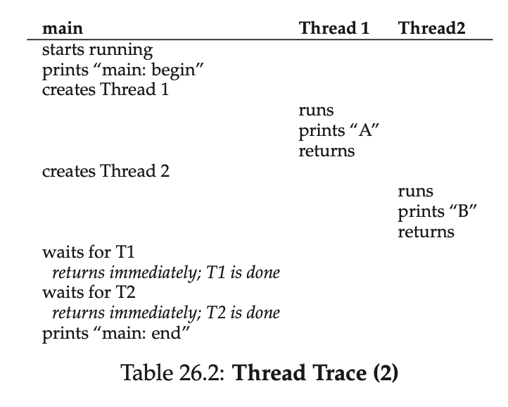 쓰레드의 생성은 함수 호출과 유사해 보이지만, 함수 호출에서는 함수가 실행을 마치면 호출자(caller)에게 리턴하는 반면, 쓰레드 생성에서는 새로운 쓰레드가 생성되어 호출자와는 독립적으로 실행된다. 쓰레드는 생성 함수가 리턴되기 전이나 후에 실행될 수 있다.