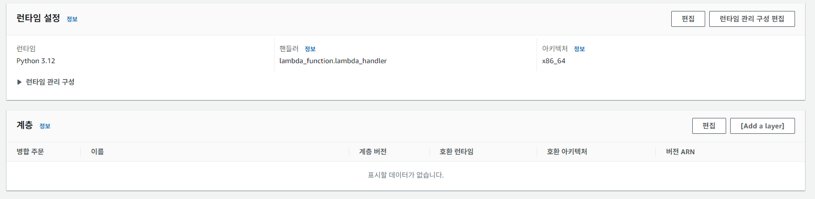 PyJWT라고 계층의 이름을 설정하고 위에서 압축한 lambda_layer.zip 파일을 업로드하고 호환 런타임은 Python 3.12로 했다. 생성을 누르고 람다 함수로 돌아가 코드 입력창 아래로 스크롤하여 계층 부분에 [Add a layer]를 클릭한다.