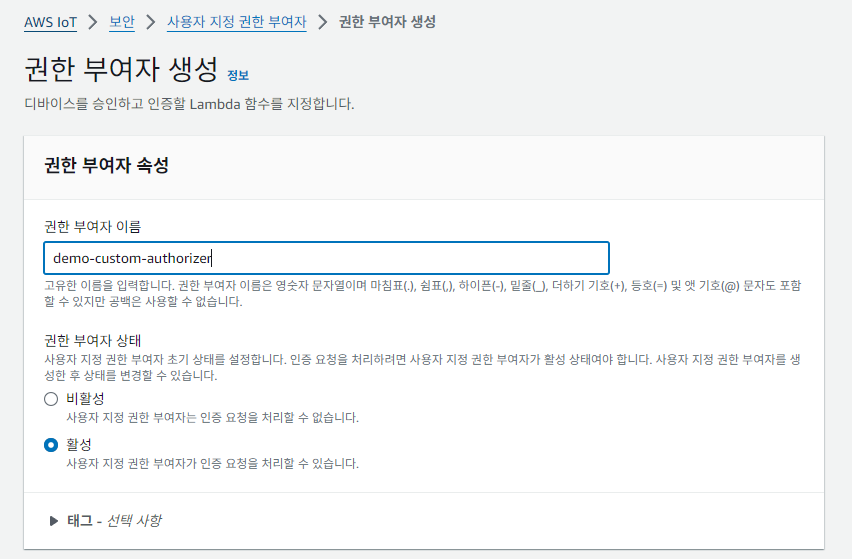 - 즉 AWS IoT Core에 연결할 때 X.509 인증서를 사용하는 방법 외에 사용자 정의 인증 로직을 이용해 토큰 기반의 인증 로직을 이용해 AWS IoT Core에 연결할 수 있도록 하는 것이다.