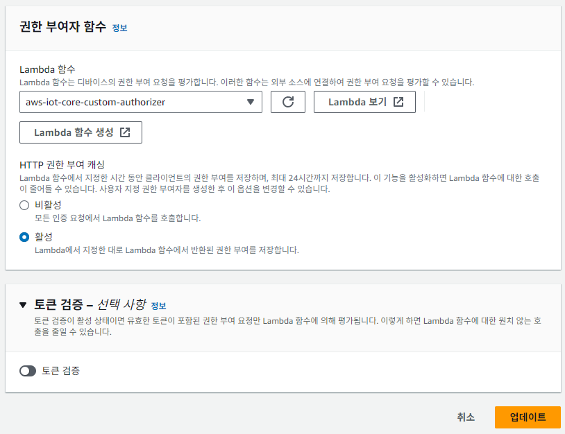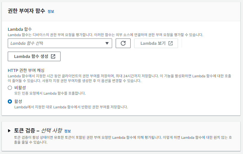 아래로 스크롤을 내리면 권한 부여자 함수를 선택하는 칸이 있다. 먼저 설명부터 하고 람다 함수를 만들러 이동하겠다. HTTP 권한 부여 캐싱의 경우 클라이언트가 권한 부여자를 이용해 인증을 할 때 매번 연결될 때마다 인증을 검사할 건지 아니면 캐싱을 해 둘 것인지를 선택하는 것이다. 나는 활성으로 설정을 하겠다.