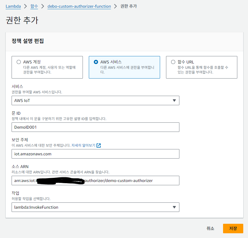 먼저 AWS 서비스를 선택하고 서비스로 AWS IoT를 선택한다. DemoID001이라고 문 ID를 설정했는데 이 값은 원하는 대로 설정하시면 된다. 보안 주체는 따로 건들지 않고 소스 ARN에 복사해 온 권한부여자의 ARN을 입력한 뒤 작업으로 lambda:invokeFunction을 선택한 뒤 저장을 한다. 이 뒤에 실제 동작하는 코드를 작성해야 하는데 내용이 많으니 1부 2부로 나누어 코드와 실행 결과는 2부에서 다루겠다.