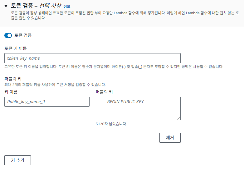 퍼블릭 키는 클릭하면 아래와 같이 표시되는데 서명된 토큰일 경우 퍼블릭 키를 사용하여 토큰의 서명을 검증할 수 있도록 하기 위해 사용된다고 한다. 최대 2개의 퍼블릭 키를 사용할 수 있으며, 이를 통해 신뢰할 수 있는 소스에서 발급되었는지를 확인하는 기능이라고 한다.