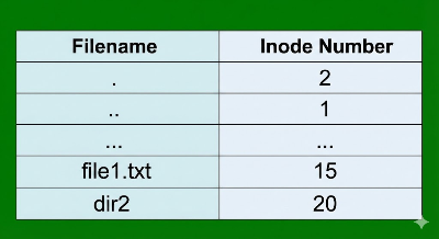 - 최적화: 파일이 아주 많은 디렉터리의 경우 선형 탐색이 느리므로, B-Tree나 해시 테이블을 사용하기도 한다(XFS, ext4 등).