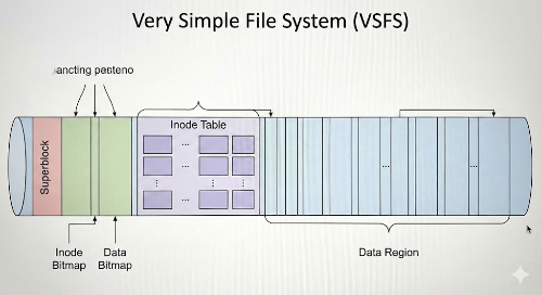 먼저 디스크를 블록 단위로 나눈다. OSTEP에서는 블록 크기를 4KB로 가정한다. 총 64개의 블록이 있다고 칠 때, VSFS는 이를 용도별로 구획한다.