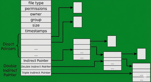 - 이중 간접 포인터 (Double Indirect Pointer): 더 큰 파일을 위해, "포인터를 가리키는 포인터 블록"을 가리킨다.
