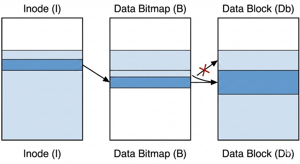 위 이미지는 Inode와 Data Bitmap은 업데이트되었지만, 실제 Data Block 기록 중에 충돌이 발생한 상황을 보여준다. 이 경우 파일 시스템은 존재하지 않는 쓰레기 데이터를 가리키게 된다.
