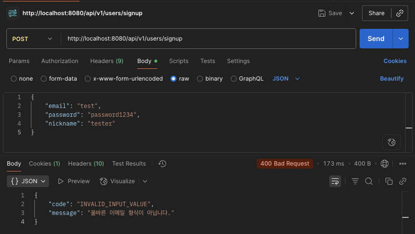만약 이메일 형식을 틀리게 보내면 어떻게 될까? @Valid가 작동하여 에러가 발생한다