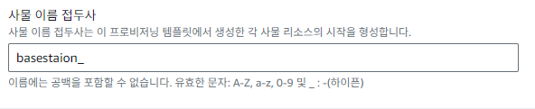 자동 사물 생성은 선택 사항이지만 기기 관리를 위해 설정을 했다. 사물 이름 접두사의 경우 본인은 basestation이라는 실무에서 사용하던 이름을 지정했지만 원하는 값으로 지정해도 된다. 예를 들어 fp_라고 작성할 수 있다.