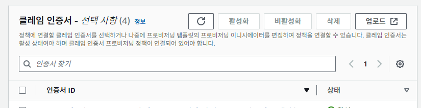 다시 템플릿 생성 화면으로 돌아가서 클레임 인증서 프로비저닝 정책을 방금 생성한 정책의 이름으로 설정한다. 그다음 아래의 클레임 인증서에 제일 처음 생성했던 클레임 인증서 값을 확인하여 활성 상태인지 확인하고 왼쪽 체크 박스를 클릭한다. 이후 다음을 누른다.