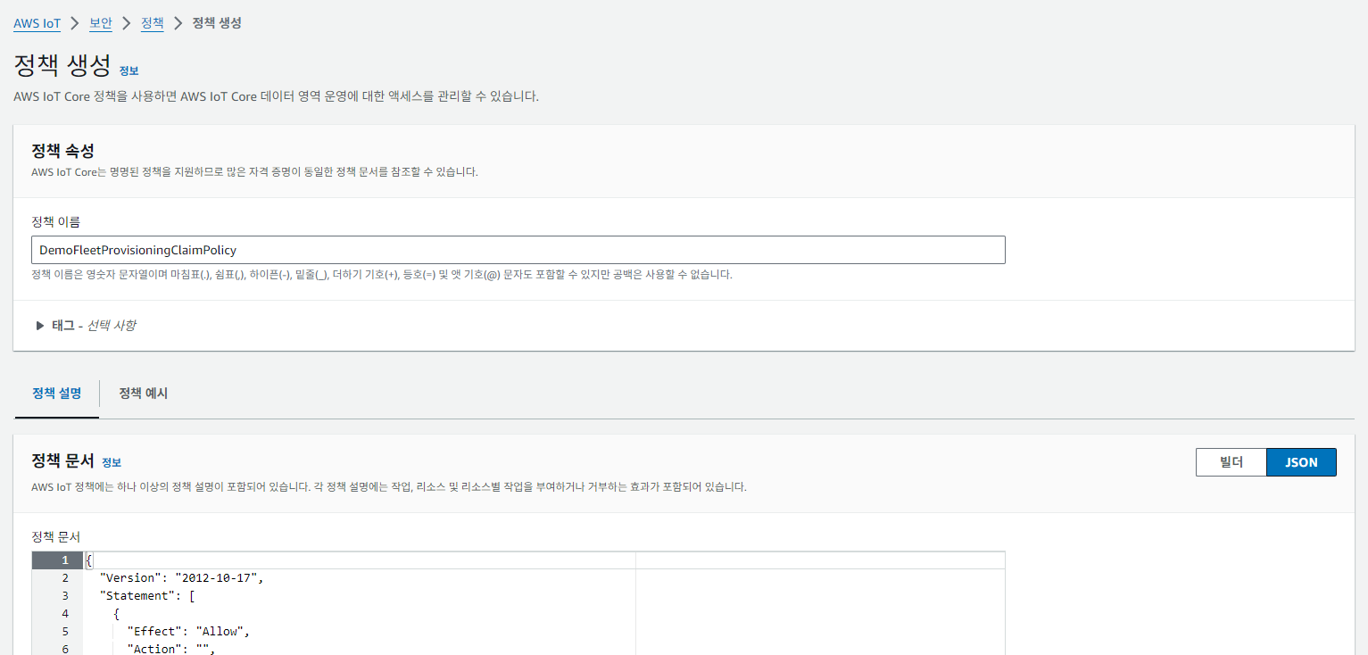 이 전에 Claim 정책을 생성했듯이 이름을 설정한다. 본인은 FleetPovisioningDevicePolicy로 명명했다. 그다음 정책을 JSON으로 작성한다 아래 정책 예시는 가장 기본 적인 정책인데 현재 실습을 위해 사용하는 정책의 기본형으로 *를 사용해서 모든 동작을 허용한다.
