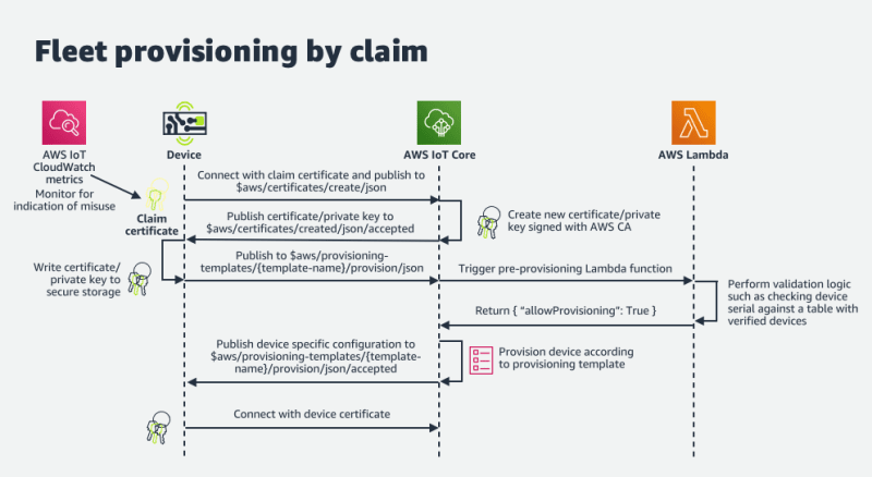 - Fleet Provisioning by Claim : 클레임 인증서를 사용하여 초기 연결을 수행한 후, 개별 디바이스가 자체적인 인증서와 IoT 정책을 획득한다. 이를 통해 초기 프로비저닝이 간소화되고, 나중에 디바이스가 개별 인증서와 정책으로 관리된다.