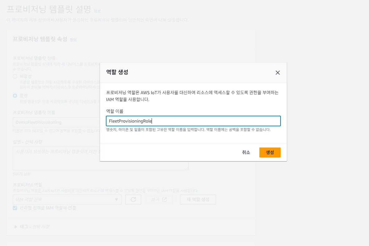 프로비저닝 템플릿 상태를 활성으로 체크하고 프로비저닝 템플릿 이름을 작성한다. DemoFleetProvisioning으로 작성했지만 원하는 이름이 있다면 해당 이름을 변경하라