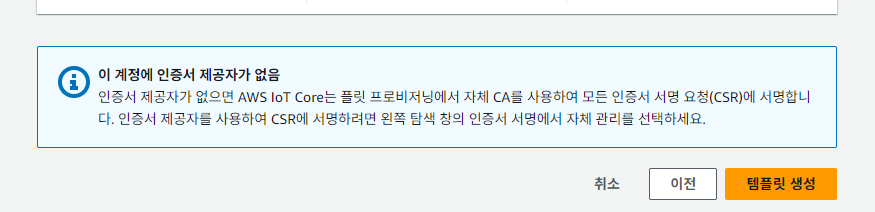 위 코드는 내가 사용했던 코드의 예시이다. 이 코드에는 Device Shadow 내용을 제거한 버전이다. 정책을 생성한 뒤 다시 템플릿 생성 페이지로 돌아온 뒤