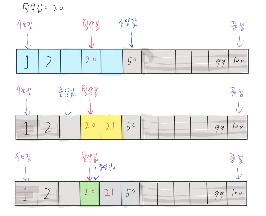 이 때 중간 값을 이용해 확인하는 이유는 이미 데이터 들이 순차적으로 정렬이 되어 있는 상황이니 중간 값을 확인했을 때 찾으려는 데이터가 없으면 오른 쪽 값을 더이상 볼 필요가 없는 것이다.