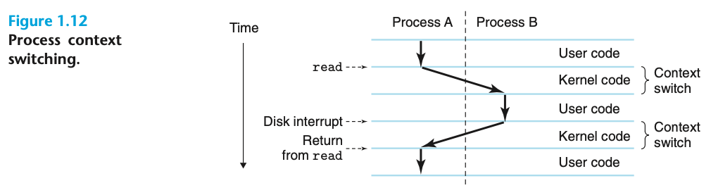 운영체제는 문맥 전환 context switching이라는 방법을 사용해서 이러한 교차실행을 수행한다. 운영체제는 프로세스가 실행하는 데 필요한 모든 상태정보의 변화를 추적한다. 이 컨택스트라고 부르는 상태정보는 PC, 레지스터 파일, 메인 메모리의 현재 값을 포함하고 있다. 어느 한순간에 단일 프로세서에서 다른 새로운 프로세스로 제어를 옮기려고 할 때 현재 프로세스의 컨택스트를 저장하고 새 프로세스의 컨택스트를 복원시키는 문맥전환을 실행하여 제어권을 새 프로세스로 넘겨준다. 새 프로세스는 이전에 중단했던 바로 그위치부터 다시 실행된다.