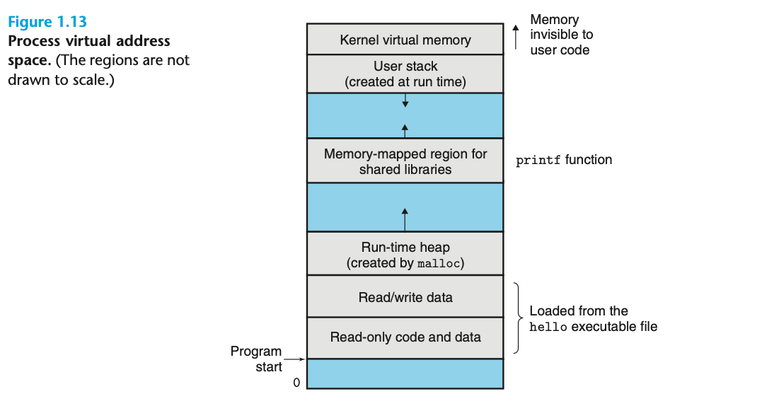 가상 메모리는 각 프로세스들이 메인 메모리들이 메인 메모리 전체를 독점적으로 사용하고 있는 것 같은 환상을 제공하는 추상화이다. 각 프로세스는 가상주소 공간이라고 하는 균일한 메모리의 모습을 갖게 된다. 리눅스에서, 주소공간의 최상위 영역은 모든 프로세스들이 공통으로 사용하는 운영체제의 코드와 데이터를 위한 공간이다. 주소공간의 하위 영역은 사용자 프로세스의 코드와 데이터를 저장한다. 그림에서 위로 갈수록 주소가 증가하는 점에 주의하라